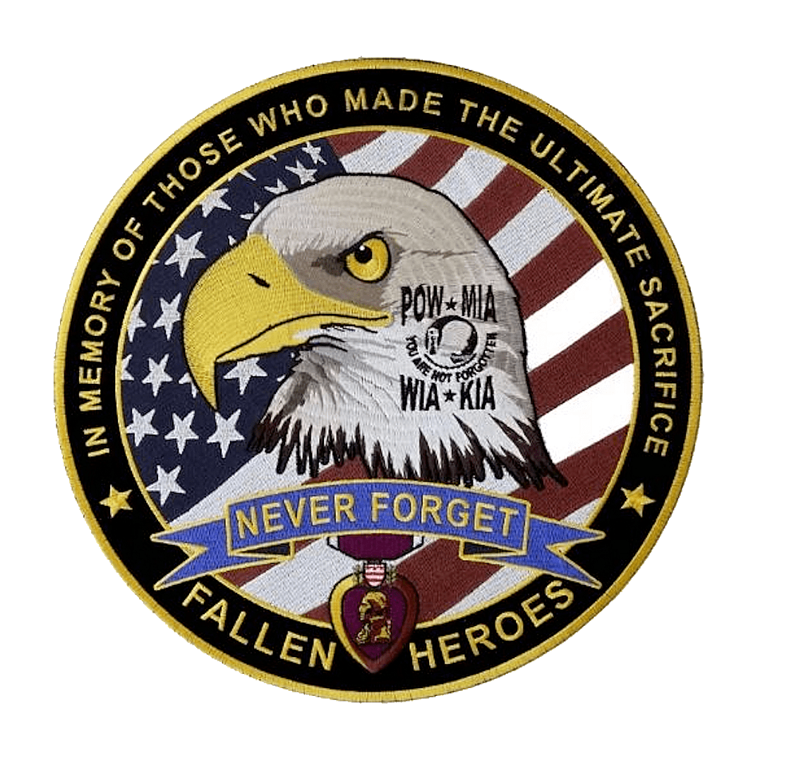 On the left front shoulder is a high quality embroidered support our troops fallen heroes patch . The colors are bright and looks great.