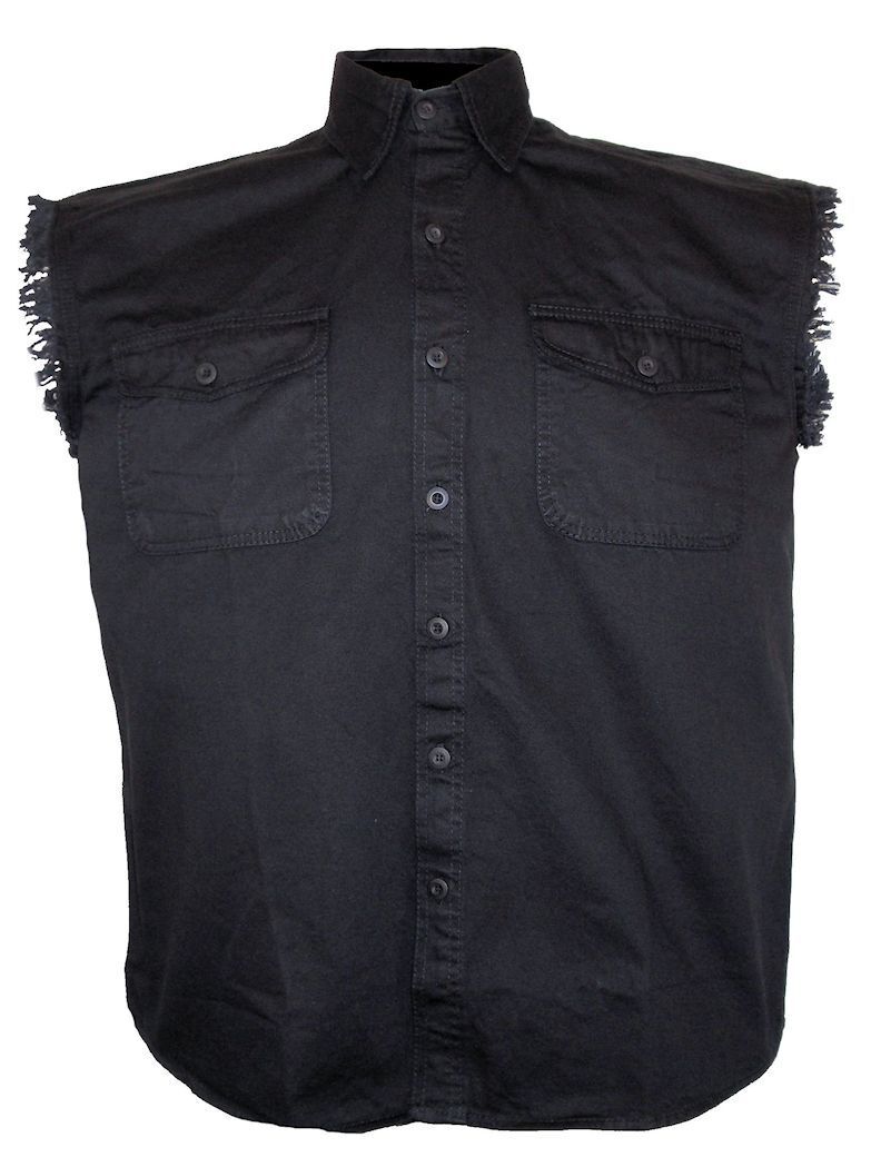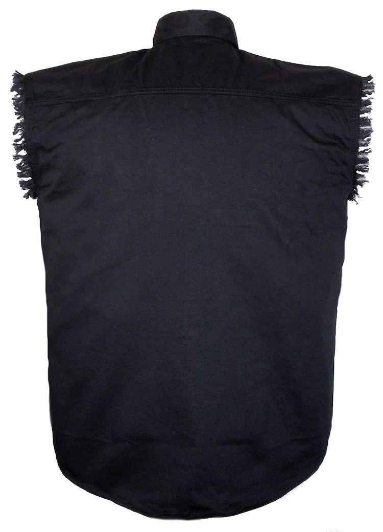 This buy it nowauction is for a brand new men’s black color denim sleeveless biker shirt. This high quality shirt from Allstate Leather has a button up front, classic collar and two button chest pockets. The sleeves are cutoff leaving the frayed ends hanging out in classic biker style.