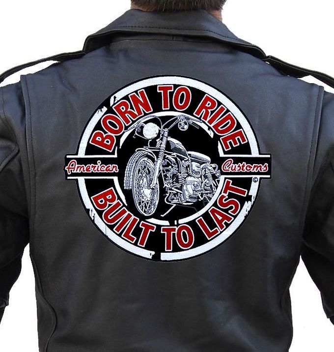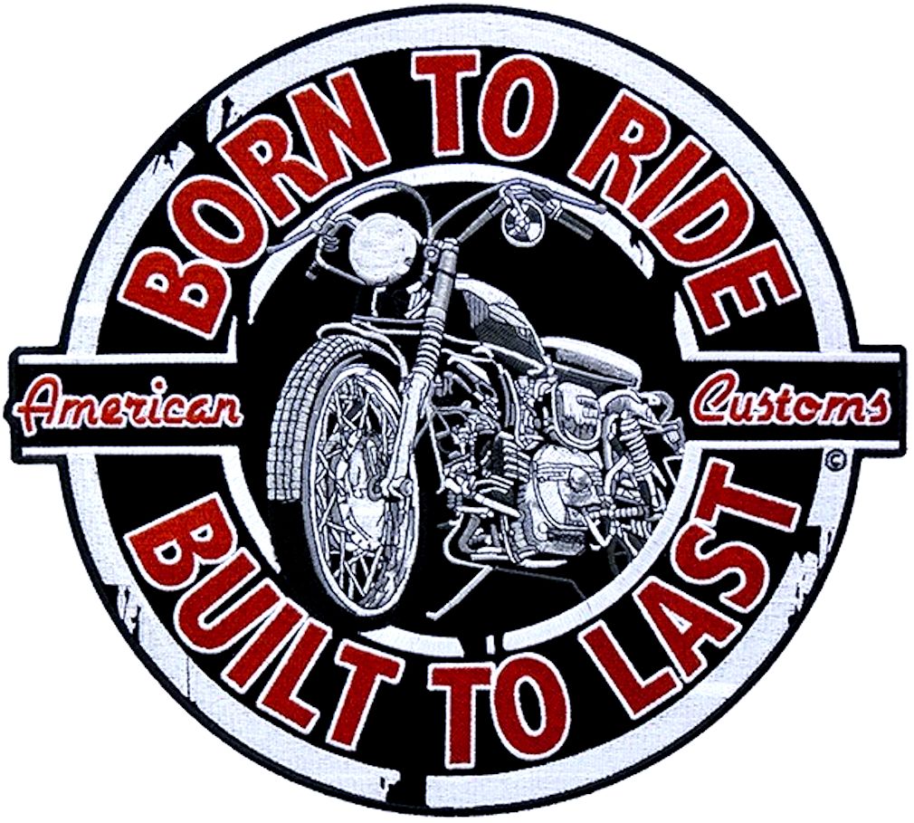 This patriotic looking biker patch is top quality made and one of my latest designs. It features a classic motorcycle in white in the center. Around it are the words “BORN TO RIDE BUILT TO LAST American Customs” in red with white borders. Can be sewn or ironed on. I have this in two sizes: