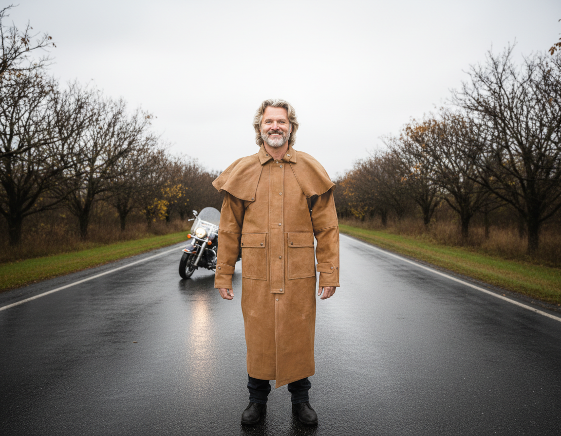 Men’s brown buffalo hide leather motorcycle jacket duster with side cape.