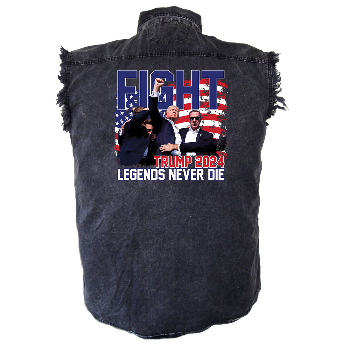 Men’s acid washed charcoal denim sleeveless shirt with Trump 2024 design!