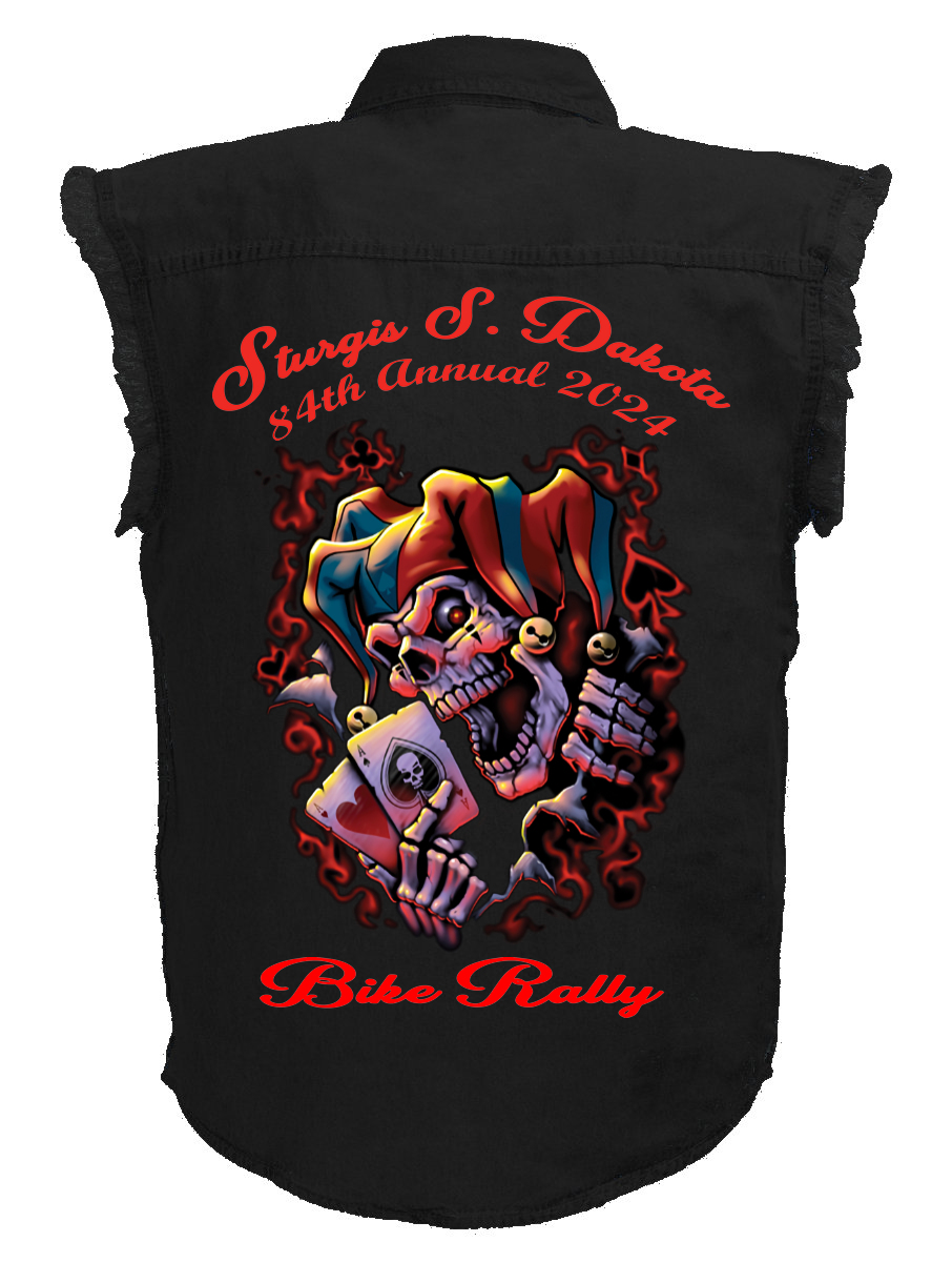 Men’s 84th Annual Sturgis Bike Rally 2024 design on black colored denim sleeveless biker shirt!