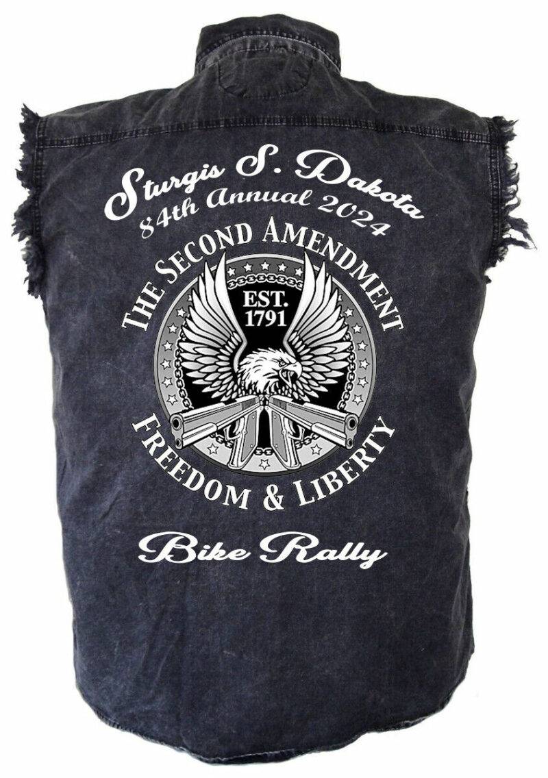 Men’s 84th Annual Sturgis Bike Rally 2024 design on charcoal colored acid washed denim sleeveless biker shirt!