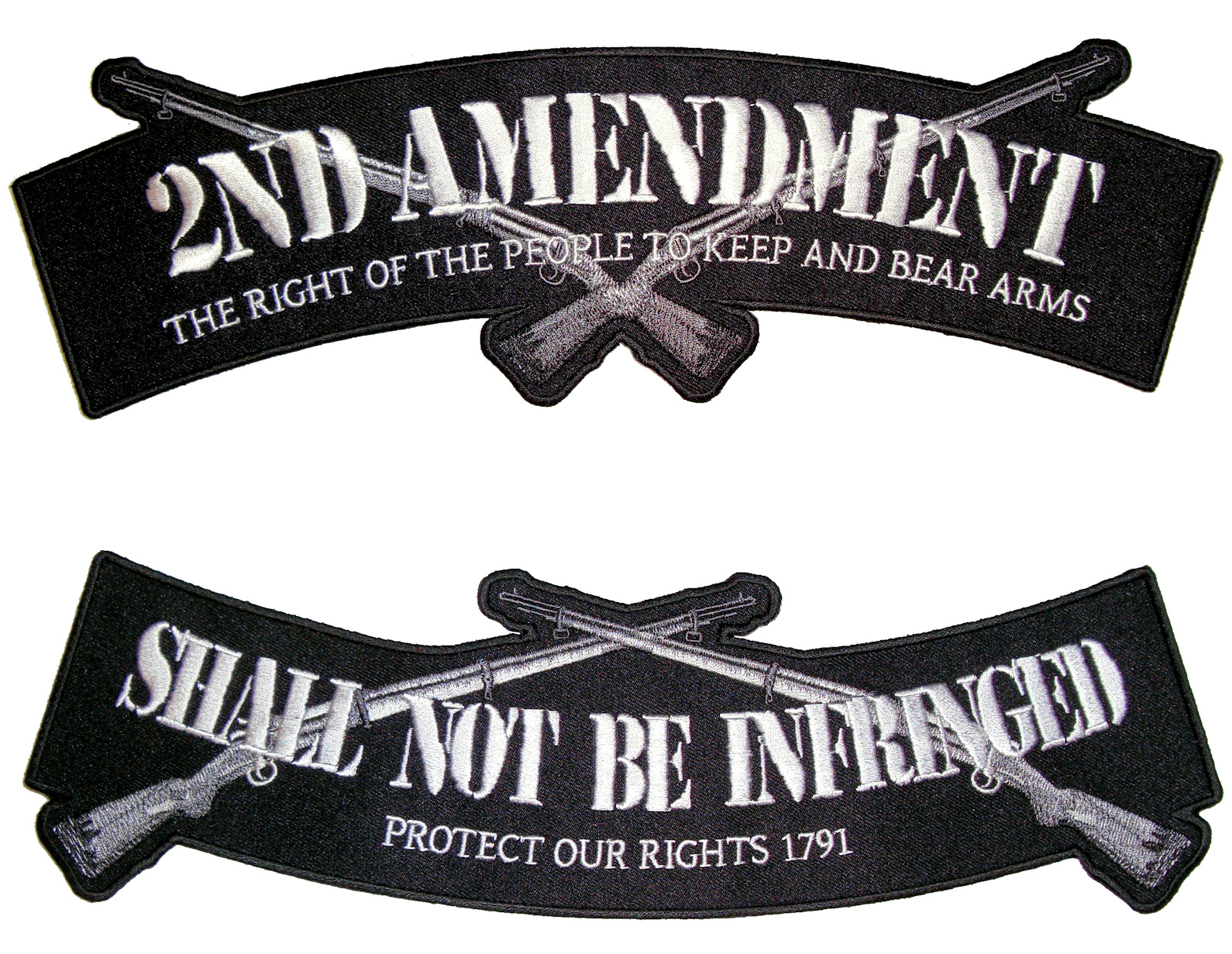 This is a great 2 piece matching 2nd amendment gun rights rocker biker patch set that goes well with a patriotic main patch, or any other patch you want to use with them. The top and bottom rocker patches have “2ND AMENDMENT SHALL NOT BE INFRINGED” in bold with “The right of the people to keep and bear arms, protect our rights 1791” in smaller text. Each one has two crossed rifles on it. It is a great patch set with lots of detail. Can be sewn or ironed on. Each rocker patch measures 12 inches wide by 3.5 inches high.