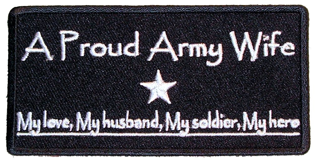 This patch features A Proud Army Wife, a star and then My love, My husband, My soldier, My hero in white text. Can be sewn or ironed on. Great for leather or textile jackets, vest, hats, caps, whatever you can think of. Measures 3.75 inches wide by 1.75 inches high.