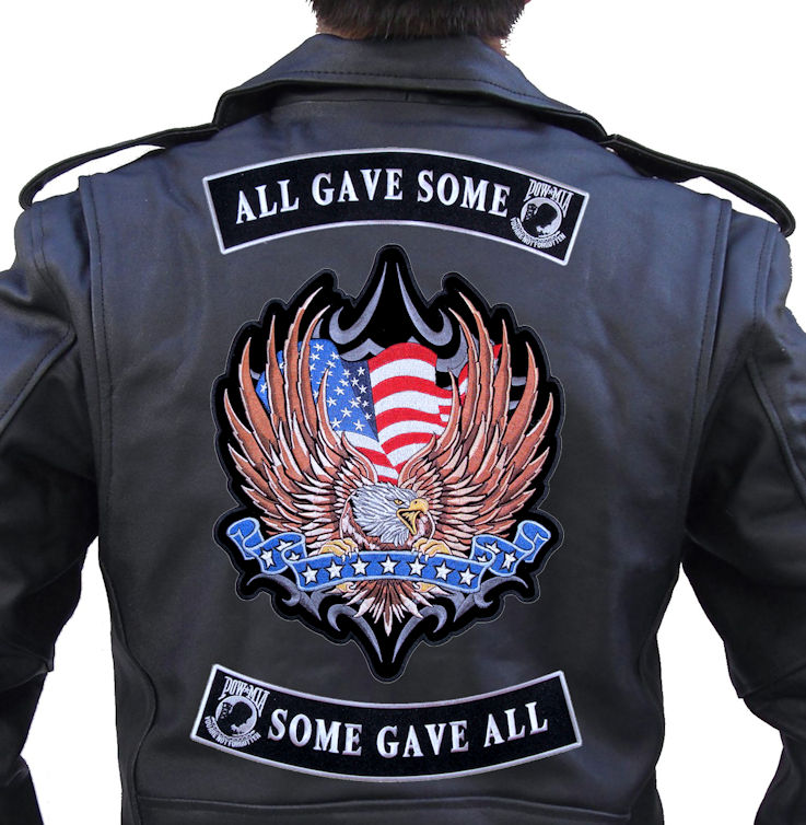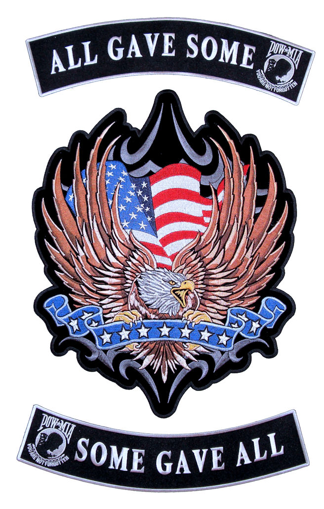 The top and bottom rocker patches say “All Gave Some, Some Gave All” with the POW-MIA logo in white. It is a great patch set with lots of detail. Can be sewn or ironed on. Main patch measures 11 inches wide by 13 inches high. Each rocker patch measures 12 inches wide by 3.5 inches high.