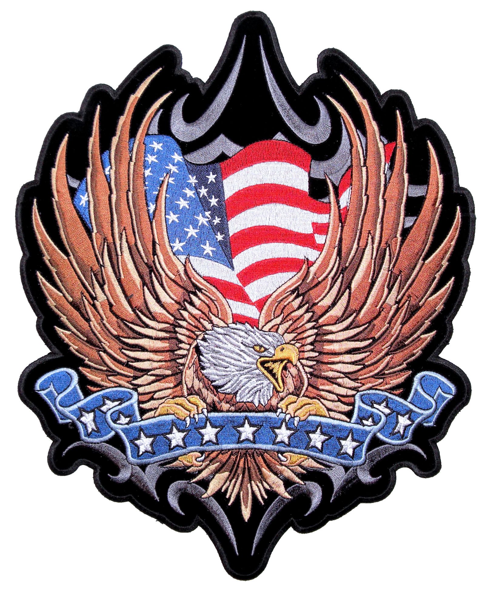 This is a great 3 piece matching patch set using my popular American Flag Eagle main patch with two matching rocker patches. The main center patch features an American bald eagle with wings out, an American flag in the background and stars at the bottom.