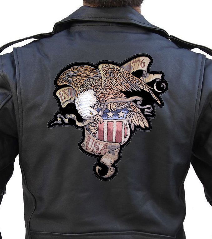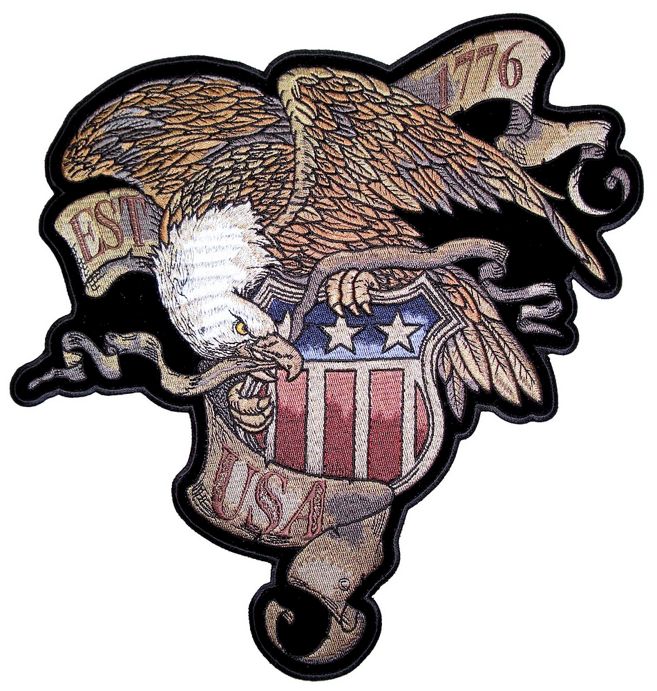 This is one of my latest biker patch designs! It’s very unique looking and a brand new design. It features a brown and gold American bald eagle with the American flag shield in it’s talons and the words “EST 1776 USA” on old time banners. It is a great patch with lots of detail. Can be sewn or ironed on. Great for leather or textile jackets, vest, hats, caps, whatever you can think of. I have this in two sizes: