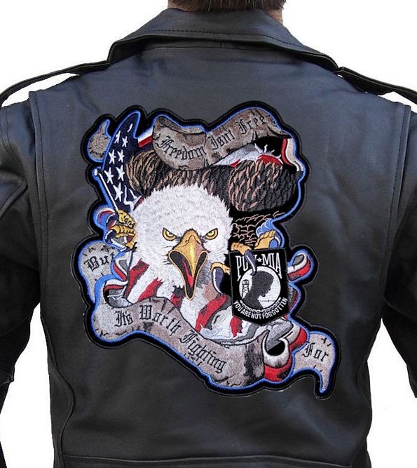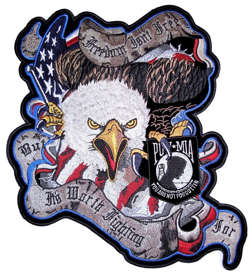 I’m happy and proud to be able to offer this great looking and unique biker patch. It features an Eagle with the American flag, the words “Freedom Isn’t Free But It’s Worth Fighting For” and a POW/MIA flag in the eagle’s claw. Can be sewn or ironed on. Great for leather or textile jackets, vest, hats, caps, whatever you can think of. I have this in two sizes: