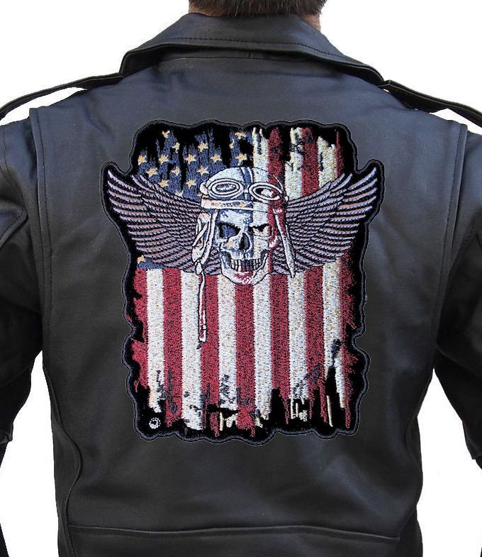 This patriotic looking biker patch is top quality made and one of my latest designs. It features a distressed American flag in the background with a fighter pilot skull and wings in front. The flag is in the correct position for when it’s facing down, which is with the stars on the left. Can be sewn or ironed on. Great for leather or textile jackets, vest, hats, caps, whatever you can think of. I have this in two sizes: