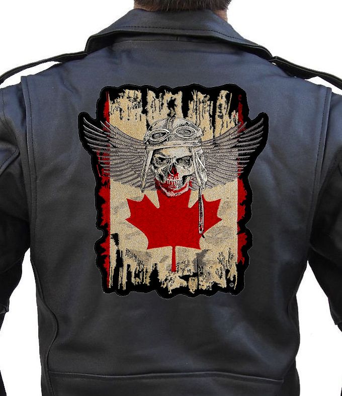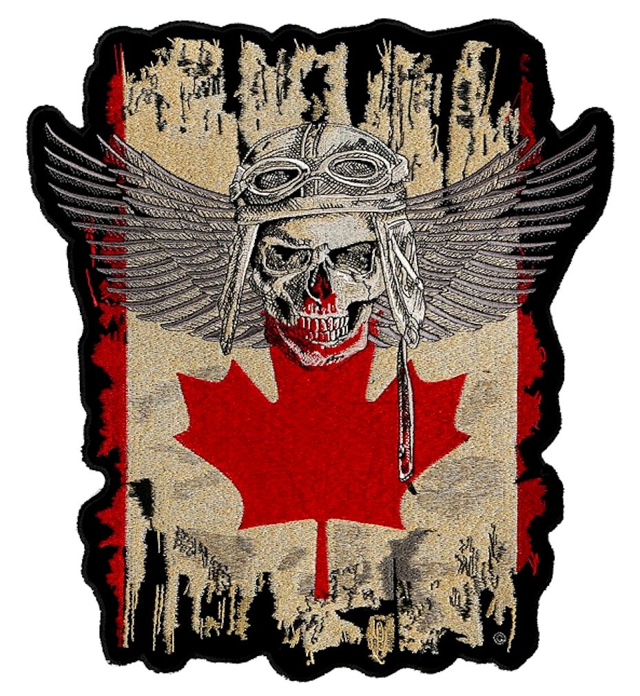 This patriotic looking biker patch is top quality made and one of my latest designs. It features a distressed Canadian flag in the background with a fighter pilot skull and wings in front. Can be sewn or ironed on. Great for leather or textile jackets, vest, hats, caps, whatever you can think of. A great patriotic patch. I have this in two sizes: