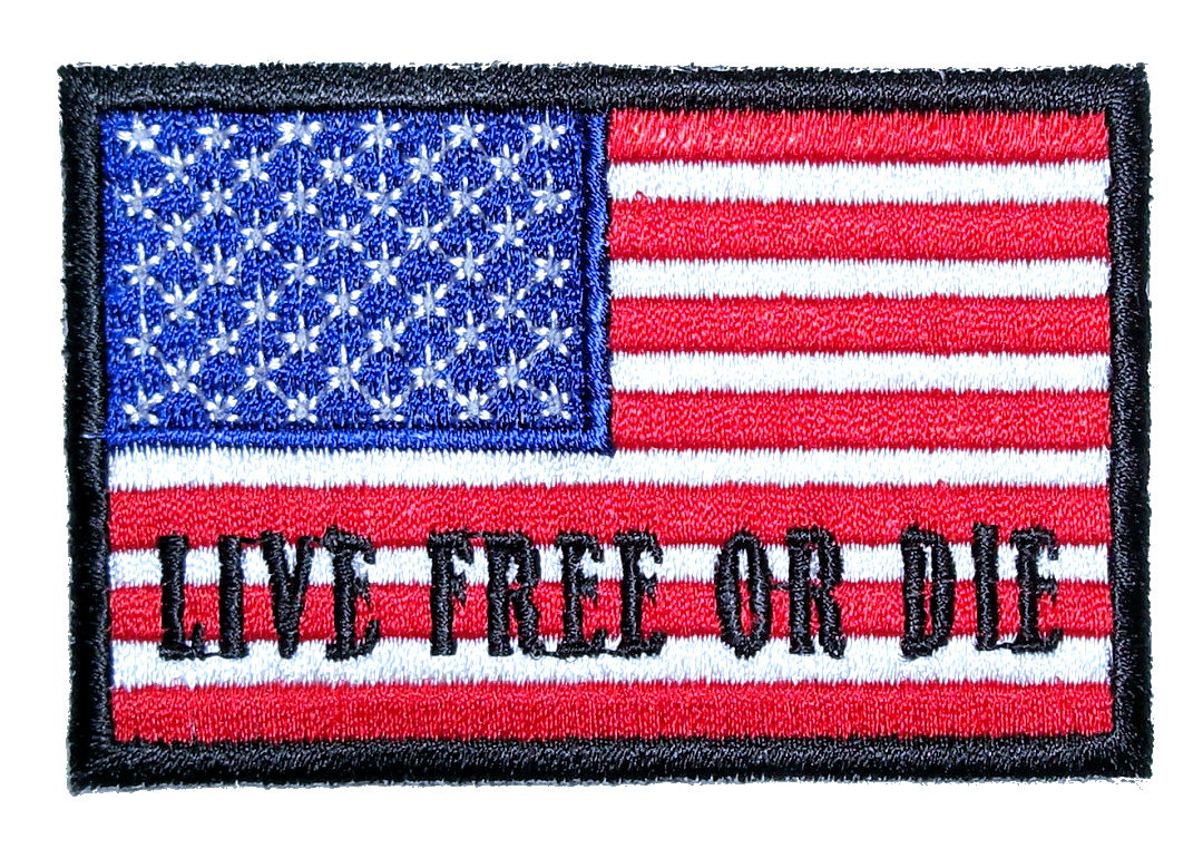 This great looking biker patch is top quality made. It features a patriotic American flag with “LIVE FREE OR DIE” on it. Can be sewn or ironed on. Great for leather or textile jackets, vest, hats, caps, whatever you can think of. Measures 3 inches wide by 2 inches high.