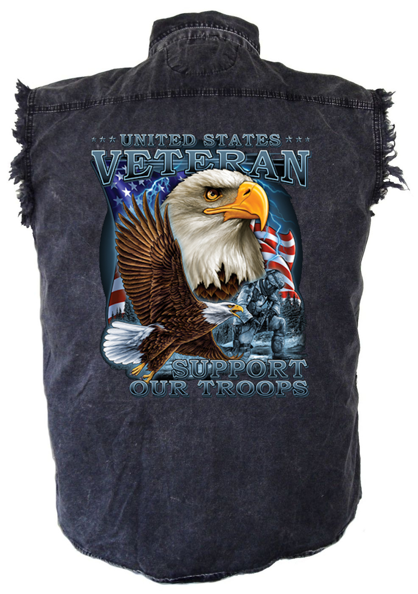 Men’s acid wash denim sleeveless shirt with US Military Veteran design!