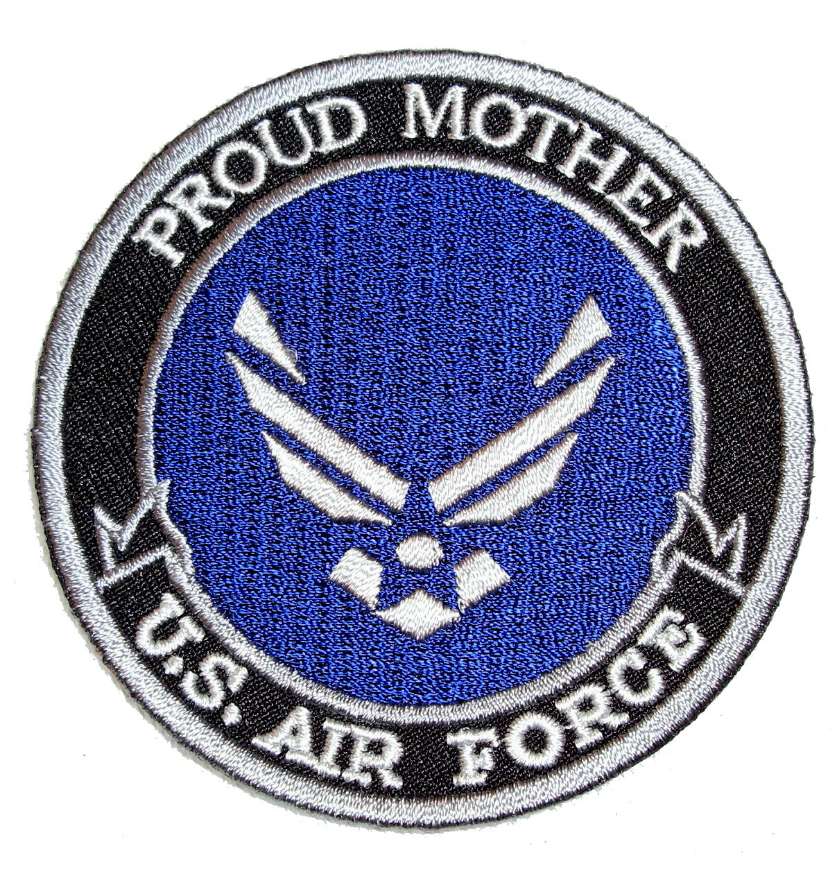 This patriotic biker patch is top quality made. It features the U.S. Air Force logo in the center, Proud Mother U.S. Air Force around it on a round patch. Can be sewn or ironed on. Great for leather or textile jackets, vest, hats, caps, whatever you can think of. Measures 3 inches wide by 3 inches high.