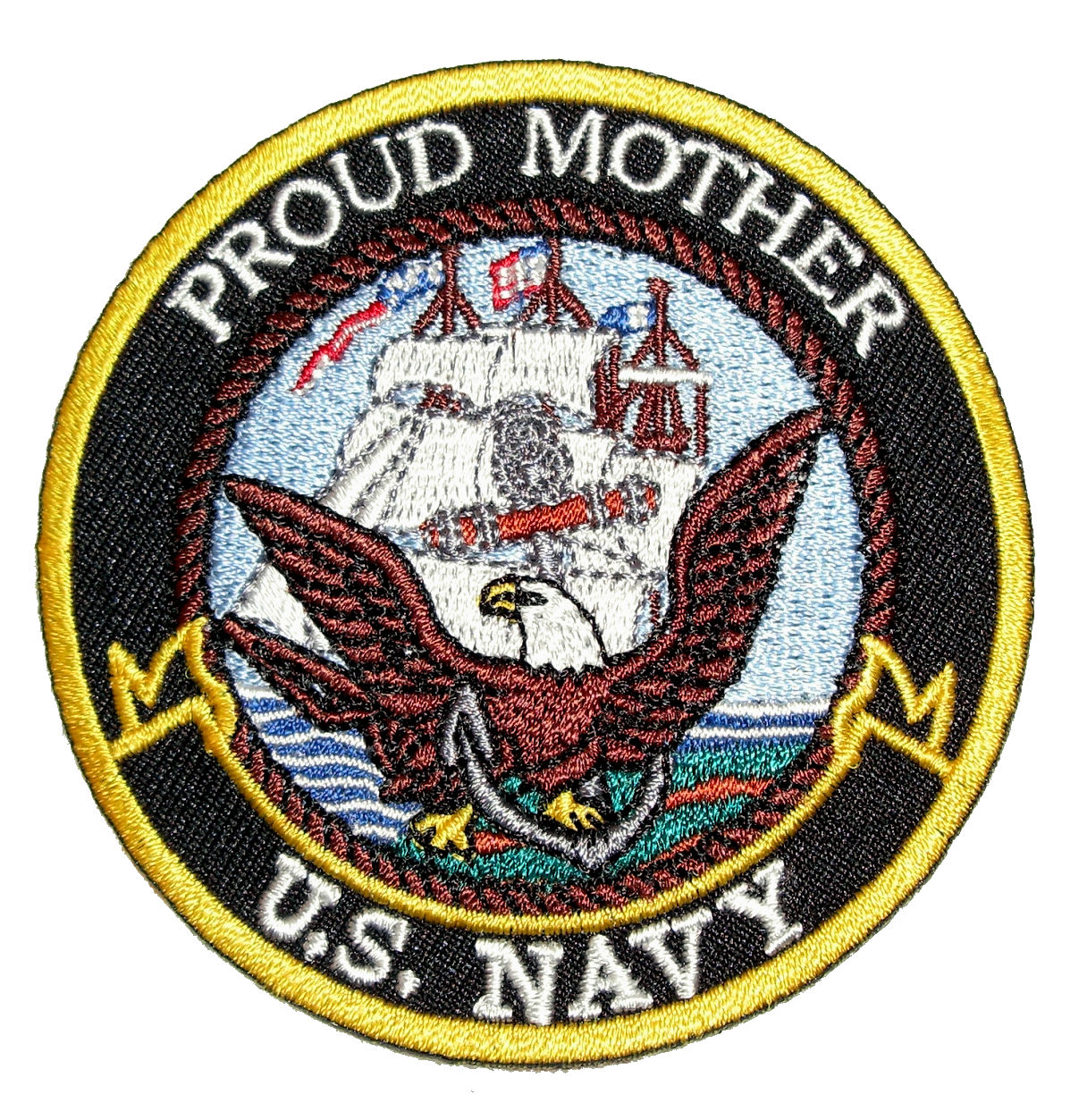 This patriotic biker patch is top quality made. It features the U.S. Navy logo in the center, Proud Mother U.S. Navy around it on a round patch. Can be sewn or ironed on. Great for leather or textile jackets, vest, hats, caps, whatever you can think of. Measures 3 inches wide by 3 inches high.