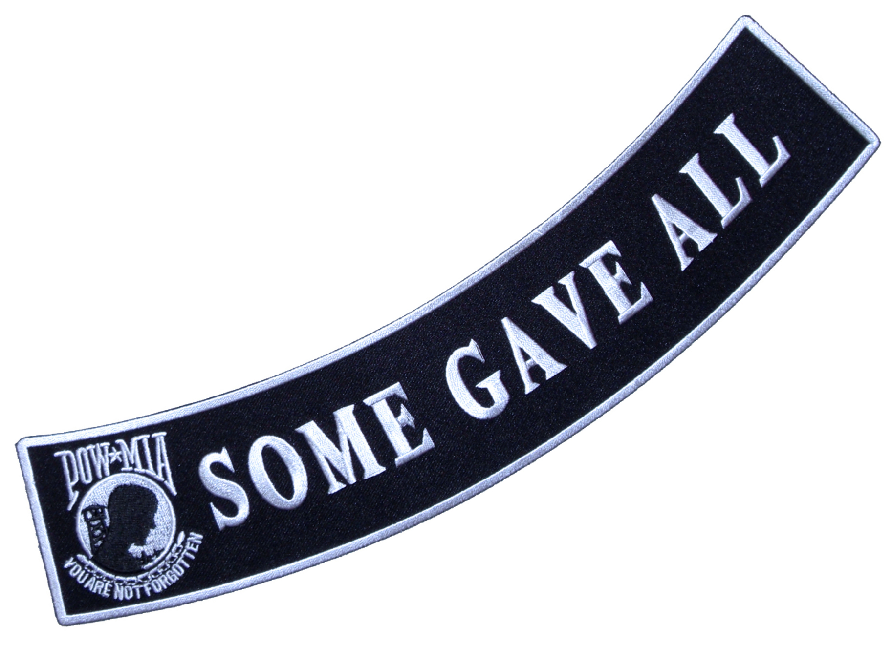 This is a great POW-MIA rocker biker patch that goes well with a patriotic main patch, or any other patch you want to use with it. This bottom rocker patch has “Some Gave All” with the POW-MIA logo in white with a white border on a black background. It is a great patch with lots of detail. Can be sewn or ironed on. Measures 12 inches wide by 3.5 inches high.