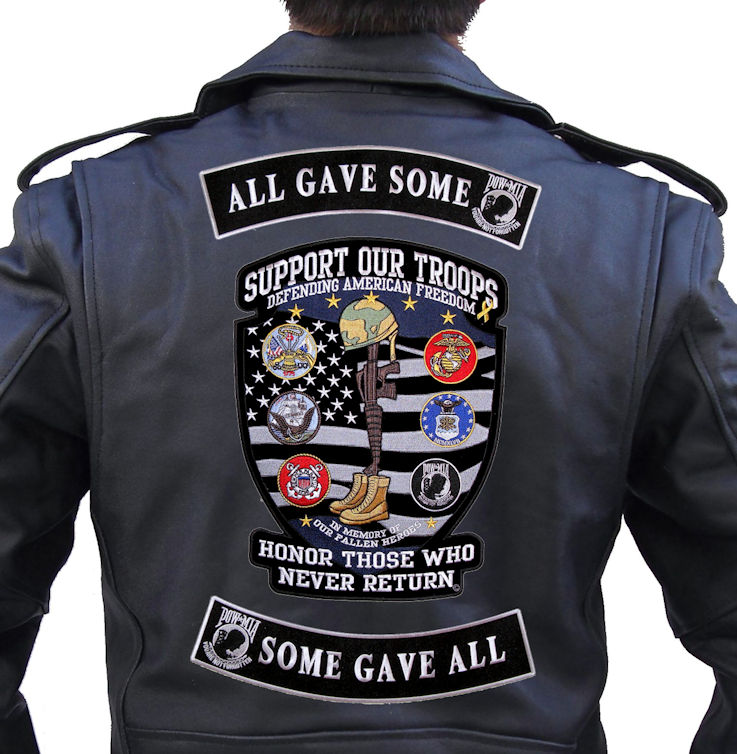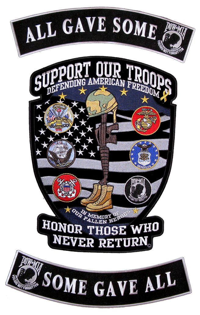 This is a great 3 piece matching patch set using my popular support our troops main patch with two matching rocker patches. The main center patch features the fallen hero, boot, rifle & helmet symbol and logos from Army, Air Force, Marines, Navy, Coast Guard & POW-MIA. At top is “SUPPORT OUR TROOPS, DEFENDING AMERICAN FREEDOM” and bottom says “IN MEMORY OF OUR FALLEN HEROES, HONOR THOSE WHO NEVER RETURN”.