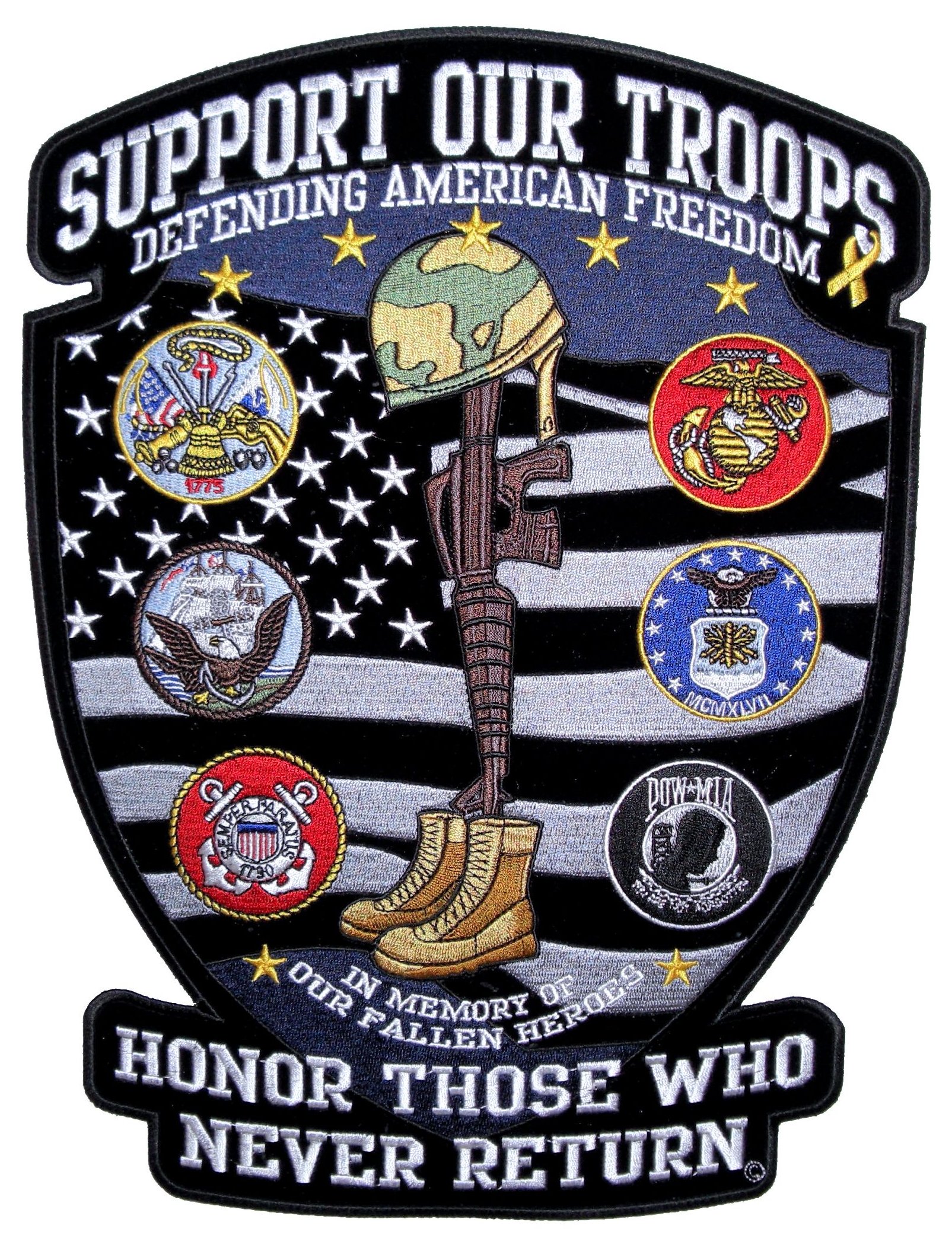 One of my best sellers. The patch features images of the fallen hero, boot, rifle & helmet symbol and logos from Army, Air Force, Marines, Navy, Coast Guard & POW MIA.  At the top of the patch it says “SUPPORT OUR TROOPS, DEFENDING AMERICAN FREEDOM” and along the bottom it says “IN MEMORY OF OUR FALLEN HEROES, HONOR THOSE WHO NEVER RETURN”. A subdued colored American Flag is in the background. It is a great patch with lots of detail. Can be sewn or ironed on. I have this in two sizes: