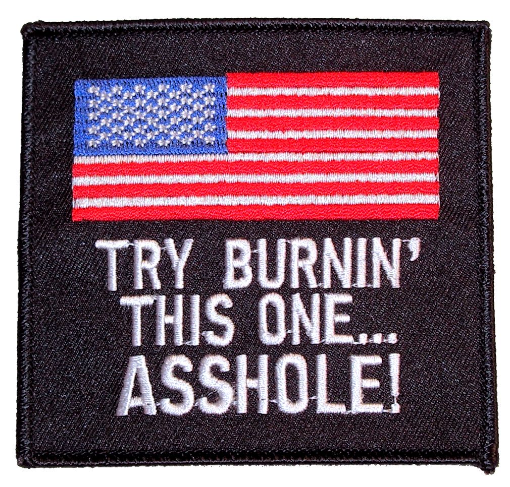 It features a patriotic USA American flag with “Try burnin’ this one,,,, asshole!” in white text. Can be sewn or ironed on. Great for leather or textile jackets, vest, hats, caps, whatever you can think of. Measures 3.5 inches wide by 3.5 inches high.