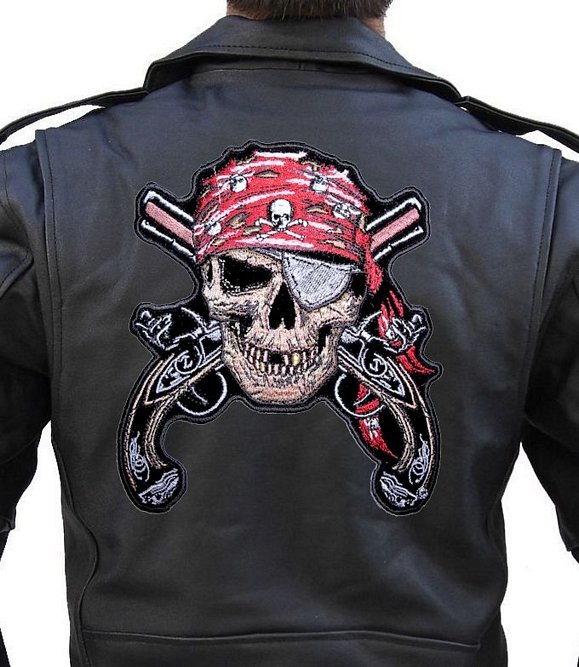 Stunning skull pirate themed biker patch packed with detail. Skeleton pirate is wearing a red head scarf and black eye patch and is missing a front tooth. The skull hovers over crossed guns. The patch can be sewn or ironed on. I have this in three sizes: