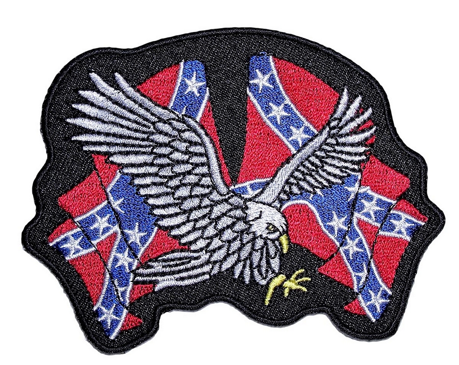 This cool looking biker patch is top quality made. Features two rebel Confederate flags with a flying eagle in front of them. Can be sewn or ironed on. Great for leather or textile jackets, vest, hats, caps, whatever you can think of. Measures 4 inches wide by 3 inches high. A cool and great looking patch.