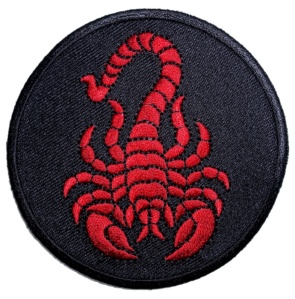 This is a cool biker patch design. It features a red scorpion on a black round patch. It is a great patch with lots of detail. Can be sewn or ironed on. Great for leather or textile jackets, vest, hats, caps, whatever you can think of. Measures 3 inches wide by 3 inches high. A great looking patch that is hard to find.