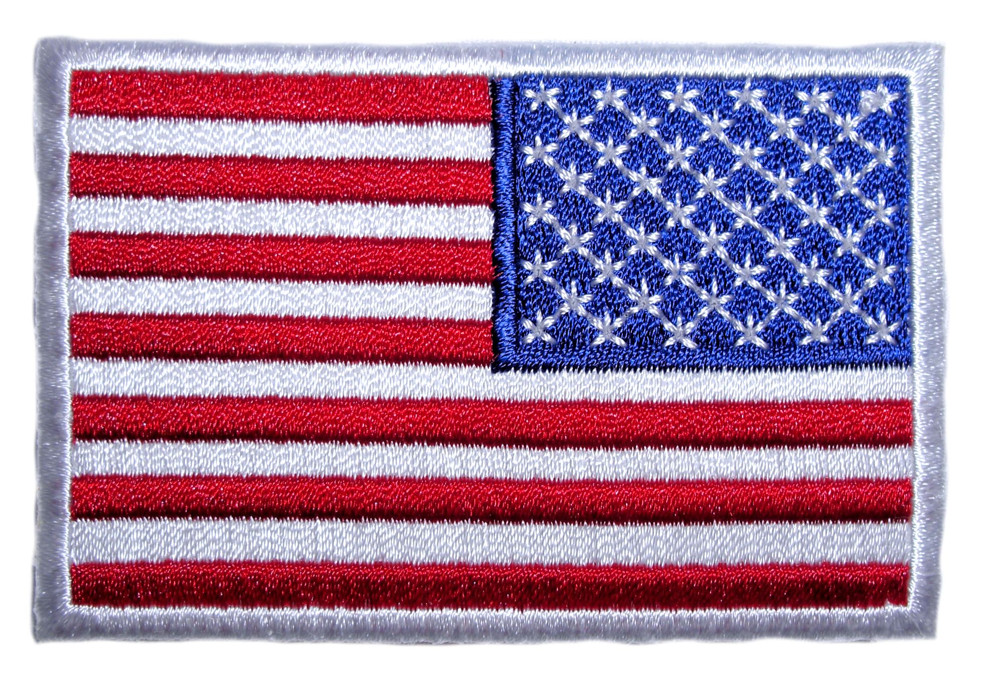 This cool looking biker patch is top quality made. Features a patriotic reversed American flag with a white border. Can be sewn or ironed on. Great for leather or textile jackets, vest, hats, caps, whatever you can think of. Measures 3 inches wide by 2 inches high. A very cool looking patriotic patch.