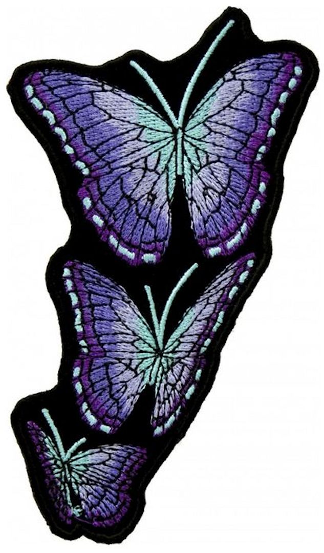 This sexy looking lady biker patch is top quality made. Features three purple and blue butterflies that curve up and to the right. I have a matching patch that has the butterflies curving up to the left for a pair, see my other patches. Can be sewn or ironed on. Great for leather or textile jackets, vest, hats, caps, whatever you can think of. Measures 3 inches wide by 5.5 inches high. A very sexy lady biker patch for a vest or jacket, check out my other patches too.