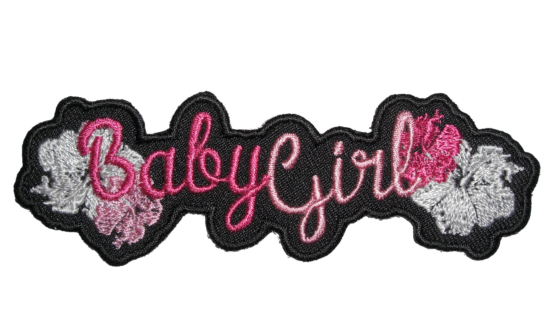This sexy lady biker patch is top quality made and a new design. It features “Baby Girl” in Pink and hot pink with white and pink flowers. Can be sewn or ironed on. Great for leather or textile jackets, vest, hats, caps, whatever you can think of. Measures 4 inches wide by 1.25 inches high.