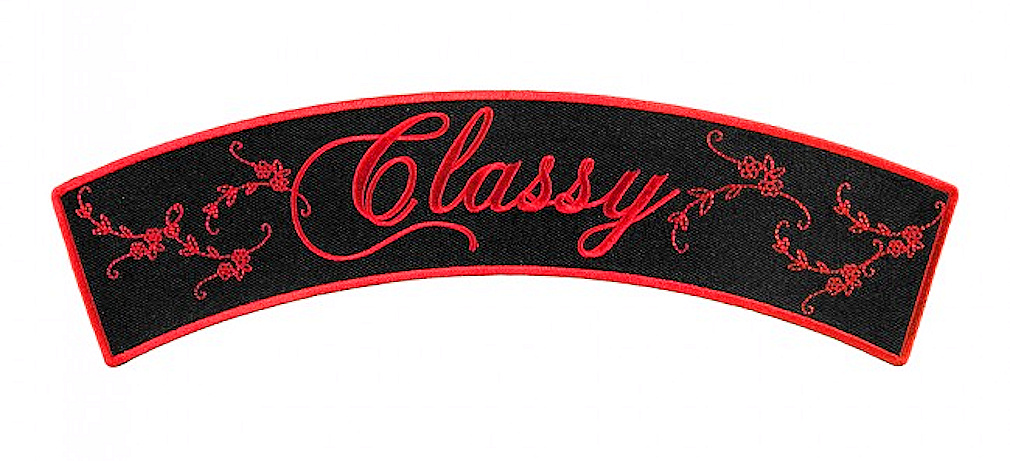 This sexy lady biker patch is top quality made and a new design not found anywhere else. It features the word CLASSY in red script text with red flowers and a red border on a black background. Can be sewn or ironed on. Great for back of jacket, with a matching patch, backpack, anything. Measures 10 inches wide by 3 inches high.