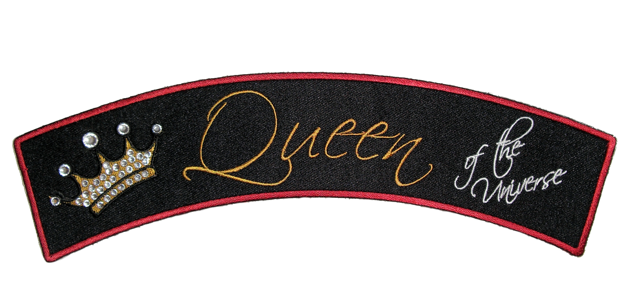 This sexy lady biker patch is top quality made and a new design not found anywhere else. It features a gold crown with real rhinestones, Queen Of The Universe in gold and white text and a red border on a black background. Can be sewn or ironed on. Great for back of jacket, with a matching patch, backpack, anything. Measures 10 inches wide by 3 inches high.