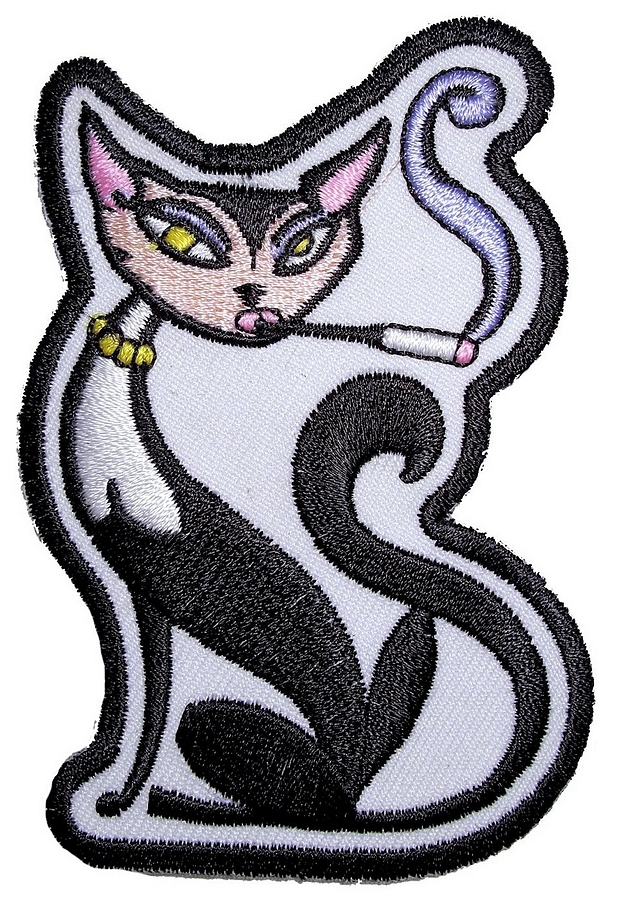 This sexy looking lady biker patch is top quality made. Features a sexy looking cat smoking a long cigarette. Can be sewn or ironed on. Great for leather or textile jackets, vest, hats, caps, whatever you can think of. Measures 2.5 inches wide by 3.5 inches high. A very sexy lady biker patch for a vest or jacket.