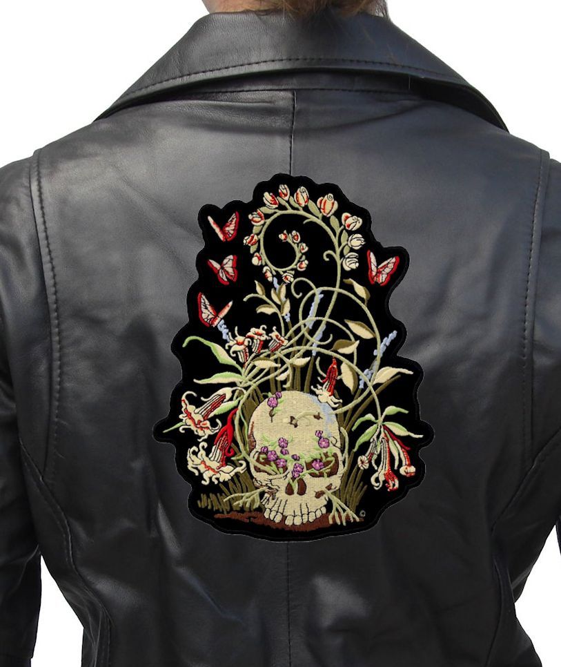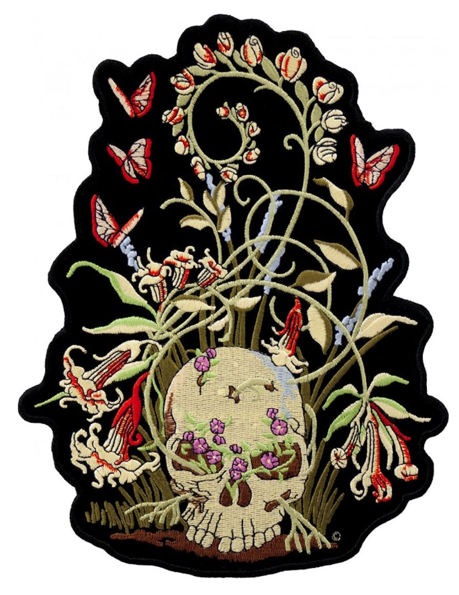 This sexy looking lady biker patch is top quality made. Features a gold colored skull with pretty flowers growing out of it and red butterflies. Can be sewn or ironed on. I have this in two sizes: