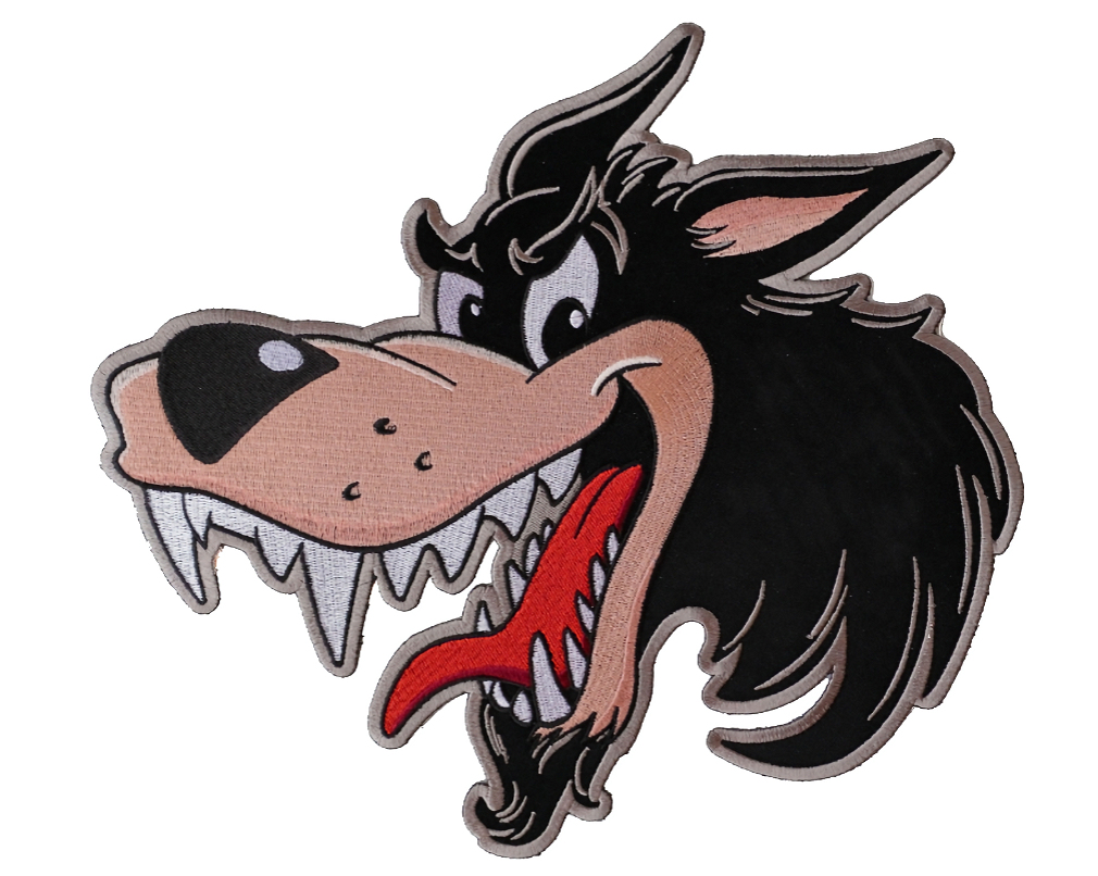 Cartoon style mean wolf embroidered patch ! 4 inches wide by 4 inches tall.