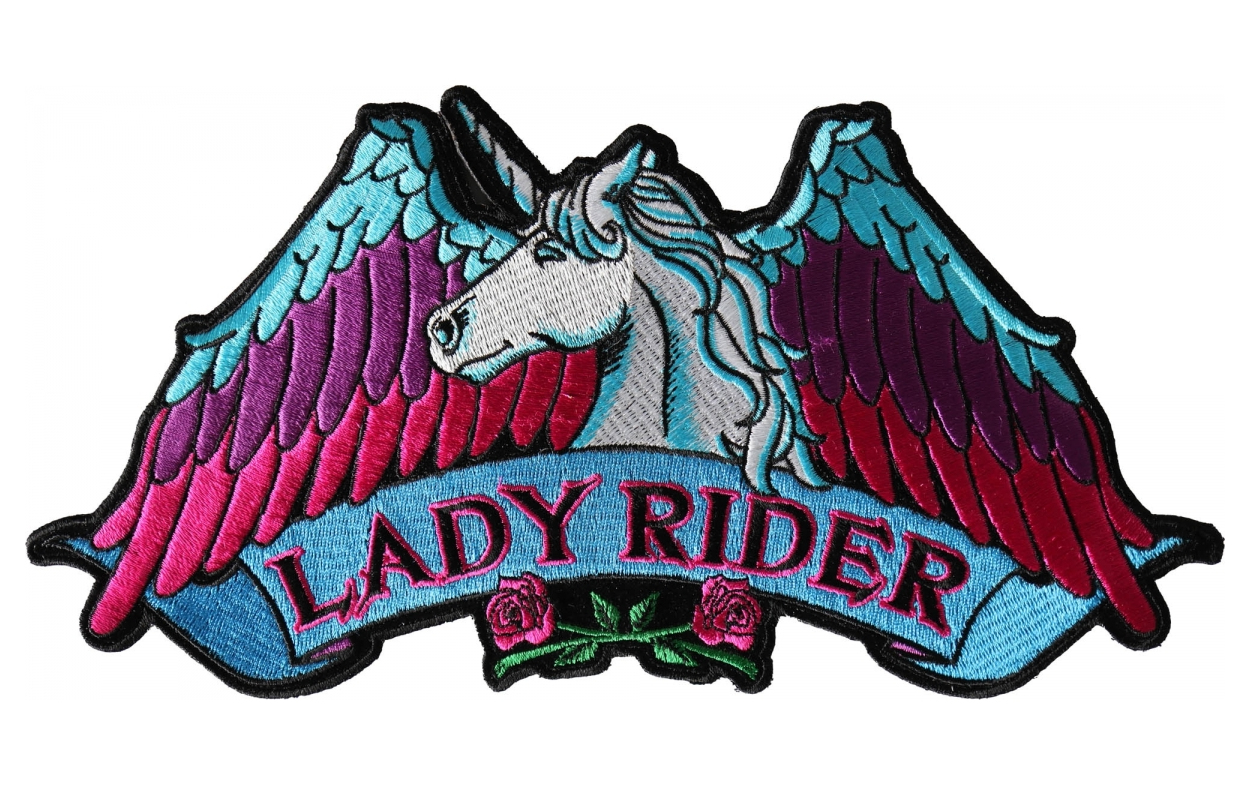 Lady Rider Unicorn wings embroidered patch ! 5 inches wide by 2.5 inches tall.