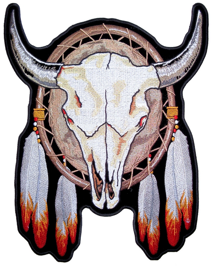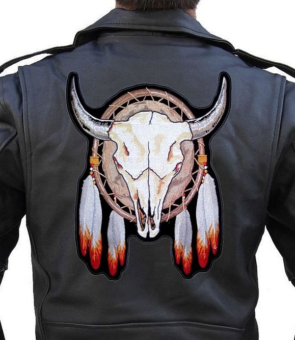 I’m happy and proud to be able to offer this great looking and unique biker patch. It features a steer skull with horns with an Indian dream catcher behind it and feathers. It is a great patch with lots of detail. Can be sewn or ironed on. Great for leather or textile jackets, vest, hats, caps, whatever you can think of. I have this in three sizes: