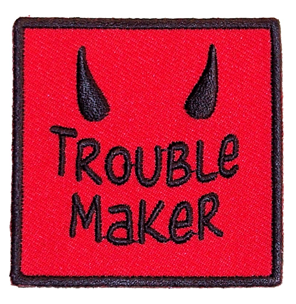 This patch features a set of horns at the top with “Trouble Maker” below it on a red background. Can be sewn or ironed on. Measures 2.25 inches wide by 2.25 inches high.