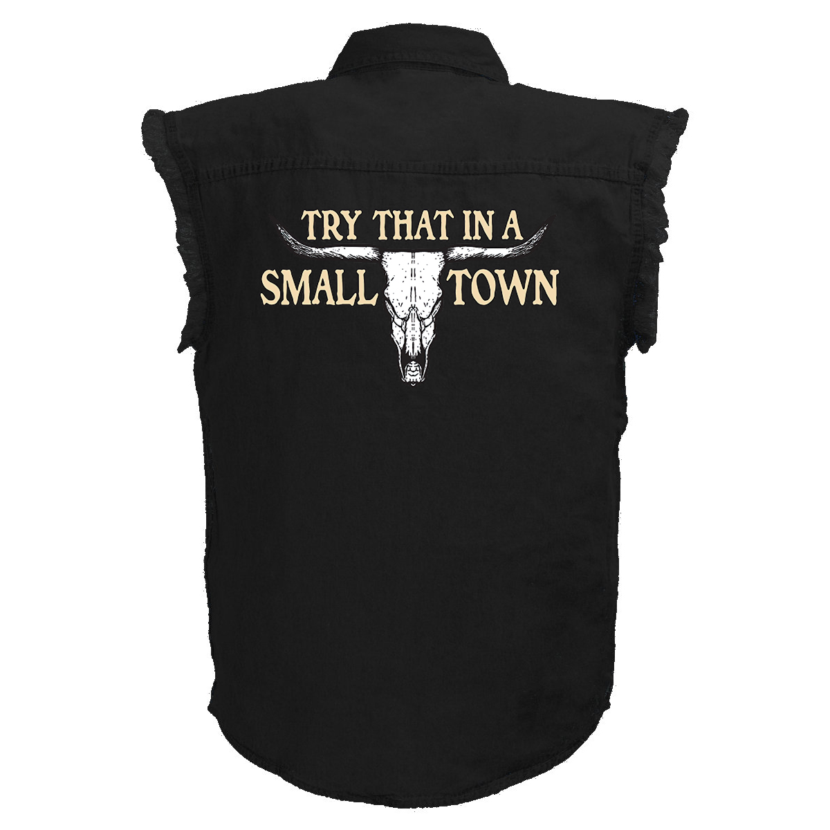 Men’s black denim sleeveless shirt with cool biker or patriotic design!