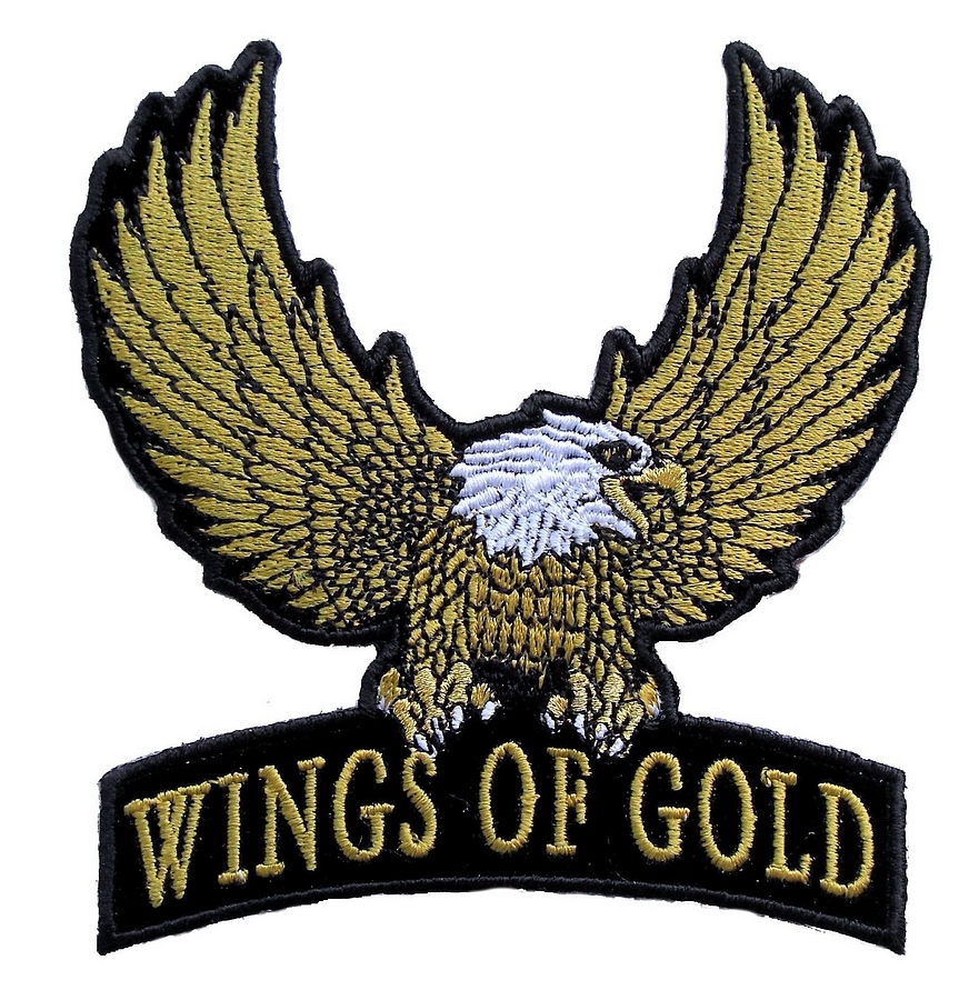 I’m happy and proud to be able to offer this great looking and unique biker patch. Medium sized, it features a gold colored American bald eagle with wings wide and the words “WINGS OF GOLD” at the bottom. It is a great looking patch with lots of detail. Can be sewn or ironed on. Great for leather or textile jackets, vest, hats, caps, whatever you can think of. Measures 4 inches wide by 4.25 inches high. A great looking patch that is hard to find.
