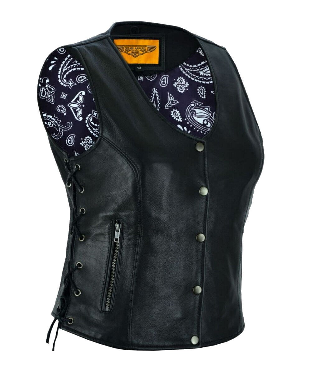 This listing is for a brand new, with tags ladies black leather biker vest. Made of premium soft naked cowhide leather, it’s made by Dream Apparel. Long list of features are: