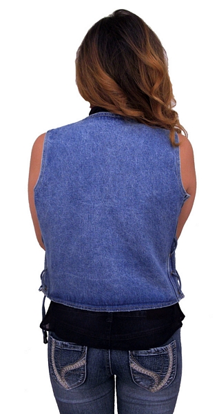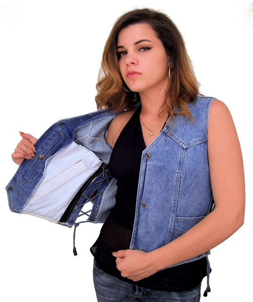 Ladies blue denim vest with side laces, 6 pockets and removable concealed carry gun holster !