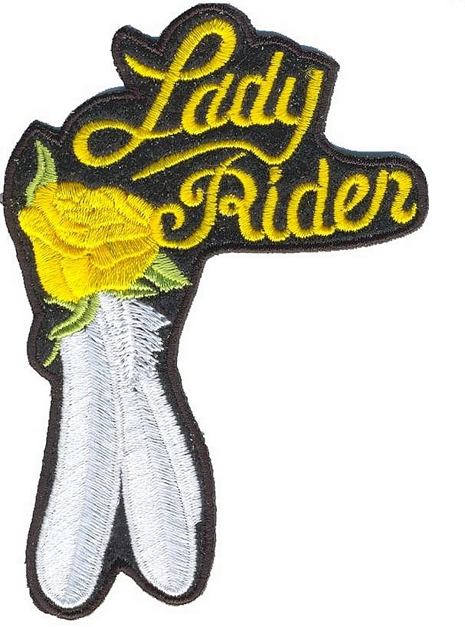 This sexy looking medium sized lady biker patch is top quality made. Features a beautiful yellow rose with white feathers under it and the words “Lady Rider” in yellow on top. Can be sewn or ironed on. Great for leather or textile jackets, vest, hats, caps, whatever you can think of. Measures 3 inches wide by 4 inches high. A very pretty lady biker patch!