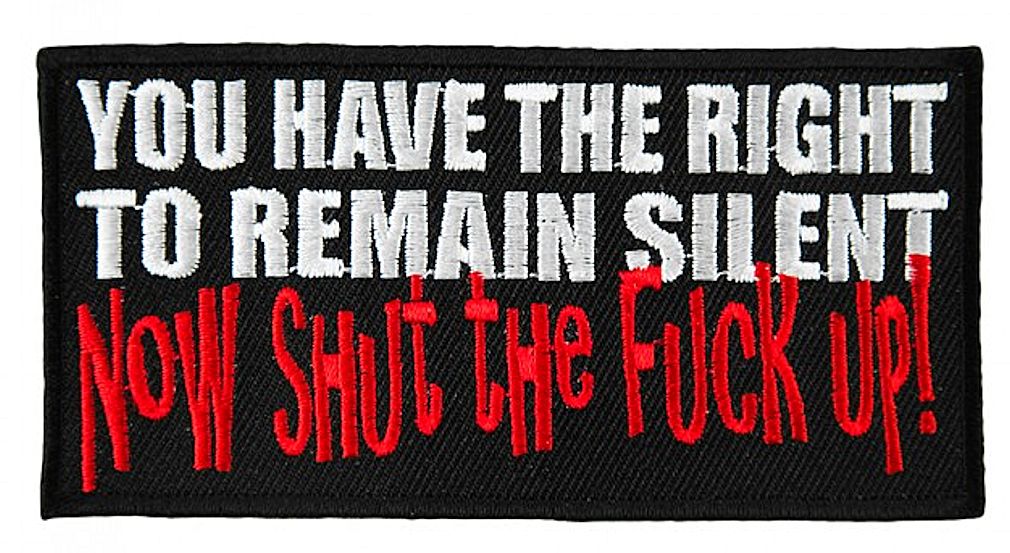 This cool looking biker patch is top quality made and one of my latest designs. It features “You Have The Right To Remain Silent Now Shut The Fuck Up!” in red and white text on a black background. Can be sewn or ironed on. Great for leather or textile jackets, vest, hats, caps, whatever you can think of. Measures 4 inches wide by 2 inches high. A great cool looking patch.